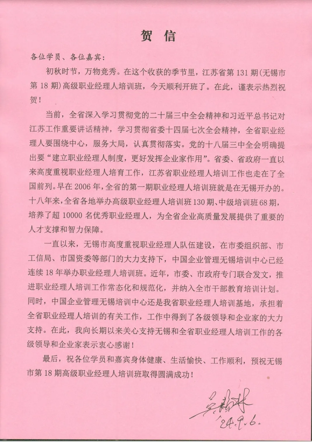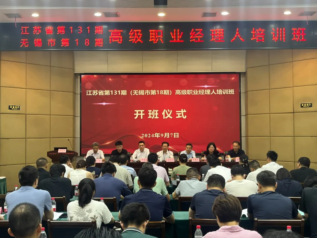 根据2024年无锡市干部教育培训计划的总体部署,深入落实新质生产力发展要求,9月7日上午由无锡市委组织部、市工信局、市国资委、中国企业管理无锡培训中心联合举办的江苏省第131期(无锡市第18期)高级职业经理人培训班在企管中心举行开班仪式。来自无锡市属国有企业集团、大中型民营企业的高管共计80名学员参加了本次开班仪式。原江苏省副省长、省职业经理人协会创会会长吴瑞林同志高度重视,专门发来贺信,对无锡市第18期高级职业经理人培训班的顺利举办表示祝贺。